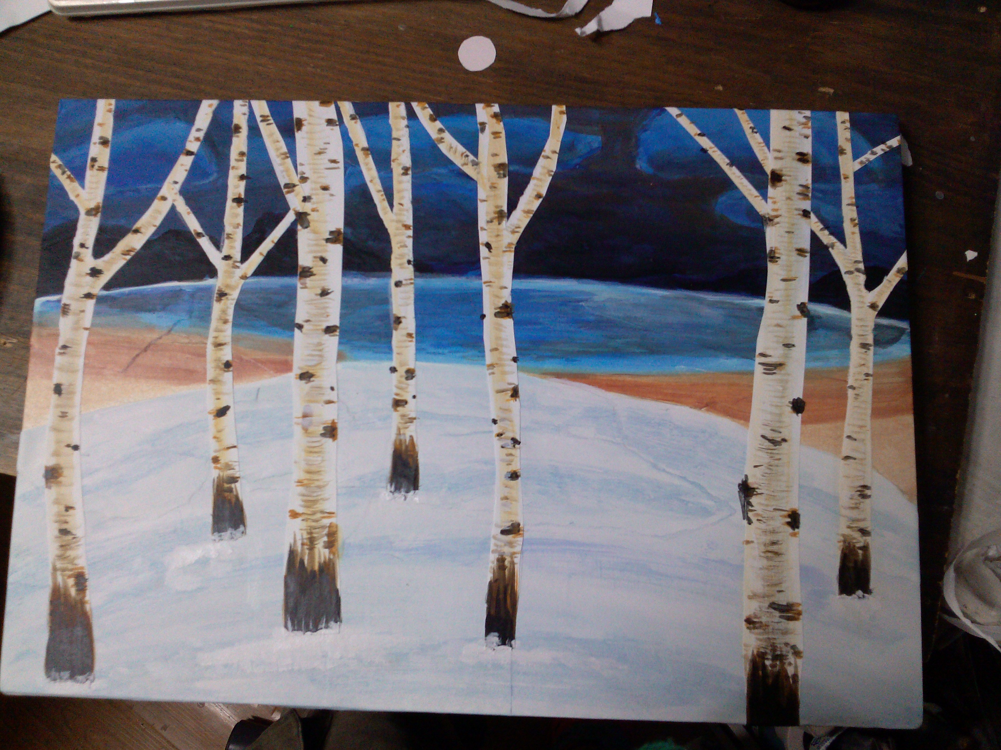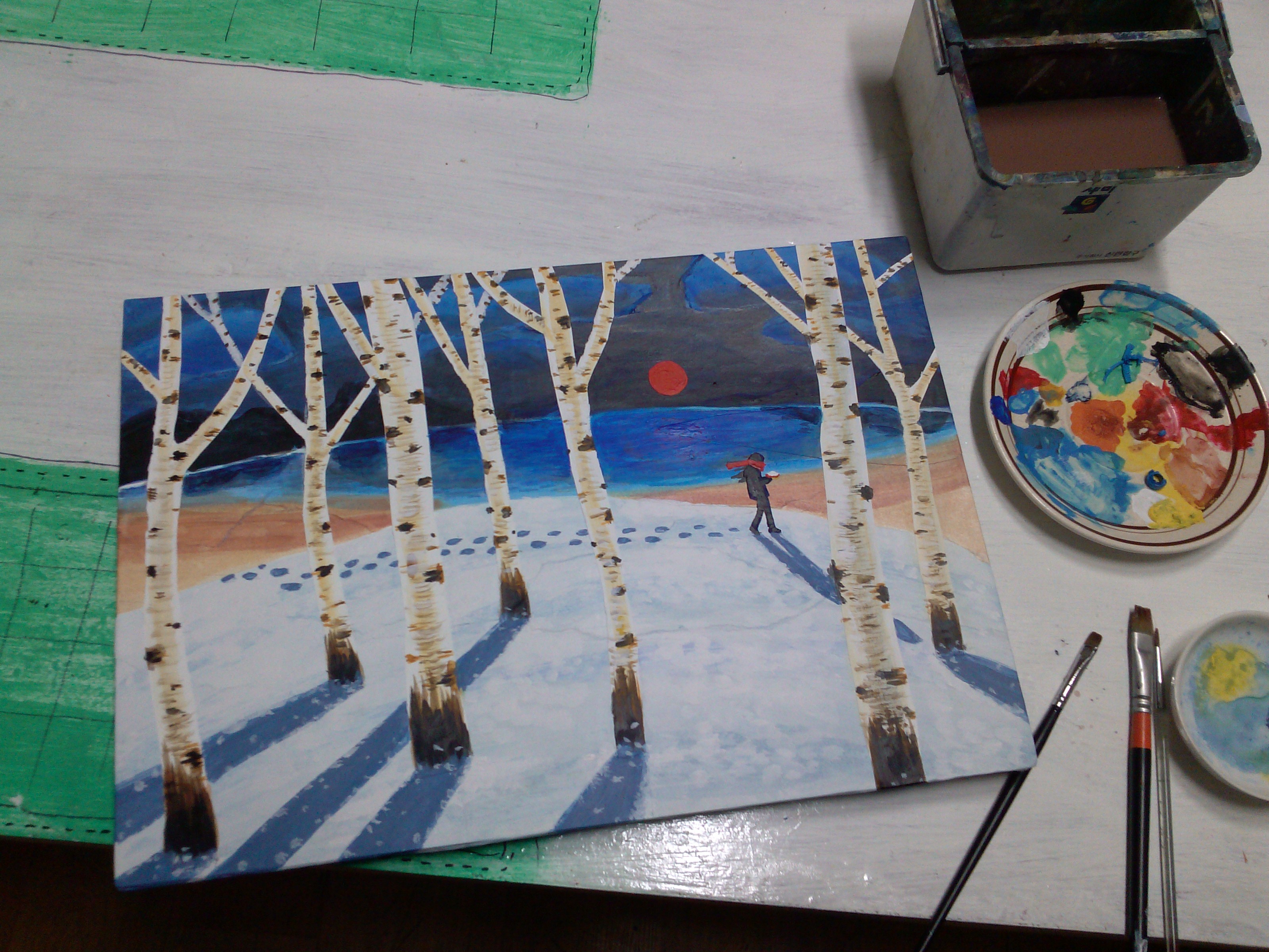 4. 앞 쪽 눈쌓인 언덕에 아까 잘라놓은 자작나무, 새벽 산책자, 해돋이 해 붙이기 -