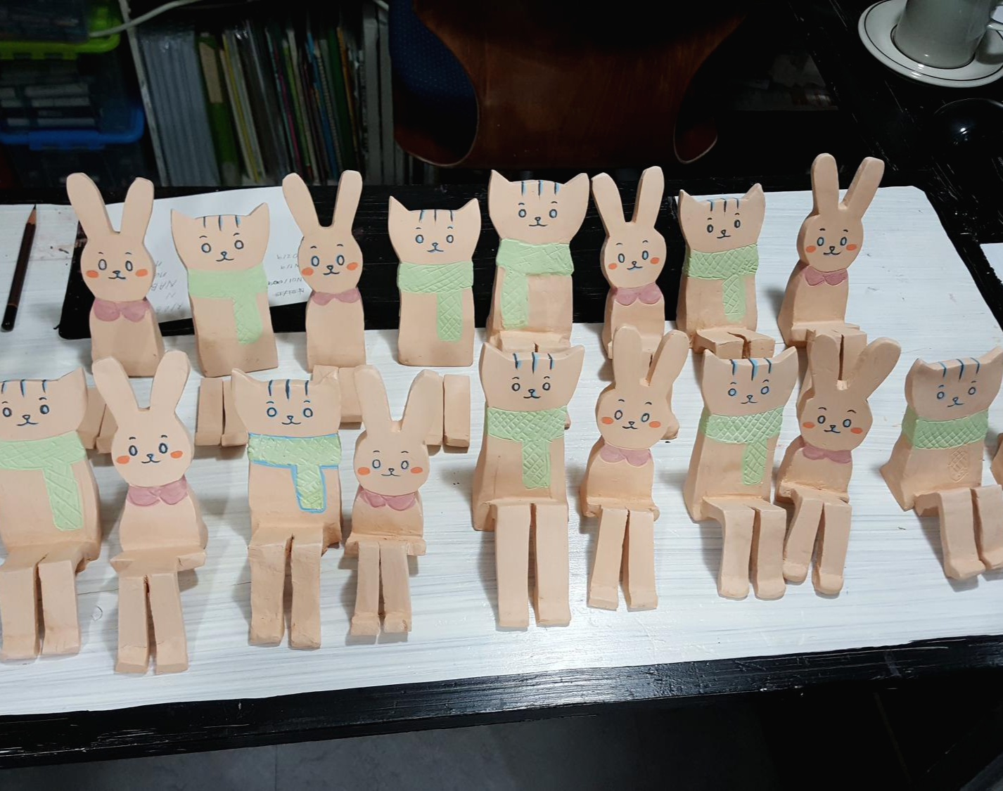 7. 샤워를 끝낸 도자기 인형들을 한 곳에 모아둡니다. 도자기 물감은 사용이 까다롭고 번거로우므로 이때 빠트리는 아이가 없도록 개수를 확인합니다