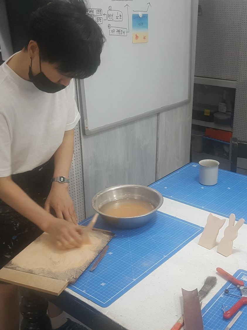 4. 초벌 중 뒤틀린 바닥면을 사포질 해서 밑면이 흔들리지 않게 해 줍니다.